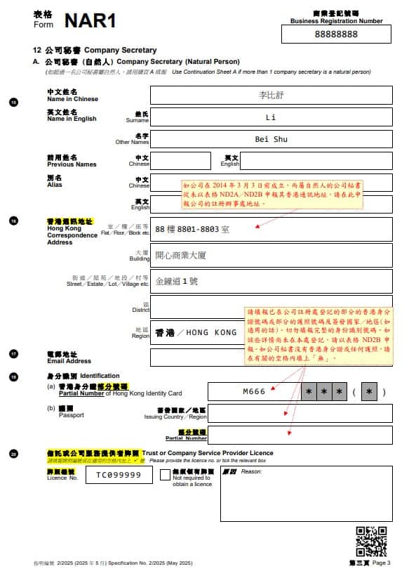 第 12 項需填報公司秘書的身份資料,並以公司註冊處在指定申報日期(Made up date)的登記狀況為準。填寫時請留意: